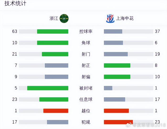 这场比赛,上海申花从场面到结果,都无法让人满意。赛后数据显示,上海申花面对浙江队,竟然全面处于劣势,控球率只有37%,角球比浙江队少4个,射门次数、传球成功率以及任意球次数,都不如浙江队。从数据统计看,上海申花最终能1:1战平浙江,不仅不应该感到遗憾,还应该感到庆幸。