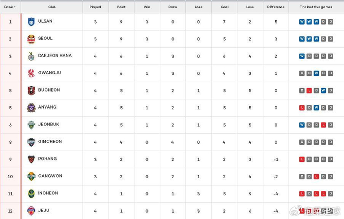 第四轮战罢,蔚山、首尔分居榜首,大田获胜后,依靠进球数优势反超光州升至第三。而浦项、江原、仁川和济州分列后四位。本周末,K1联赛第五轮将展开争夺,随着强队开始找回赢球感觉,届时比赛会更加精彩纷呈。