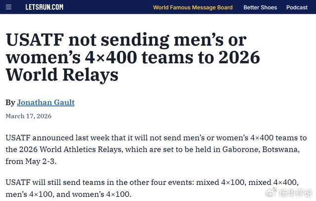 2026年世界田径接力赛将于5月在博茨瓦纳哈博罗内打响,美国田协官宣重磅决定,将放弃派遣男、女4×400米接力队参赛,仅保留混合接力及男女4×100米项目的参赛阵容。这一选择让原本竞争激烈的4×400米赛场失去了传统劲旅,也让外界对美国田协的赛事布局产生诸多疑问。