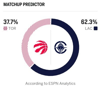 小卡或战老东家!ESPN明日胜率预测:快船为62.3% 猛龙37.7%