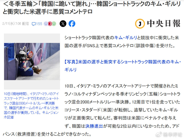 有意思的是,韩国网友以前主要是攻击抹黑中国短道运动员,这次冬奥会金吉莉被撞倒,他们也管不了这么多了,美国人也不放过。这也让西方媒体切身领教到韩国网友的“厉害”,各种诅咒和污言秽语刷新三观。