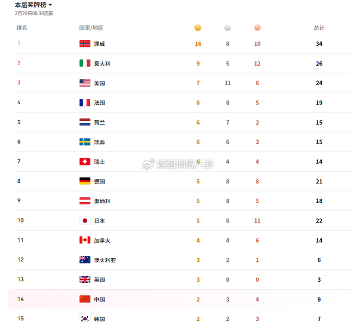 目前,冬奥会奖牌榜继续呈现两极分化态势:挪威队以16枚金牌、8枚银牌、10枚铜牌,总计34枚奖牌遥遥领先。意大利队9枚金牌5枚银牌和12枚铜牌,排名第二。